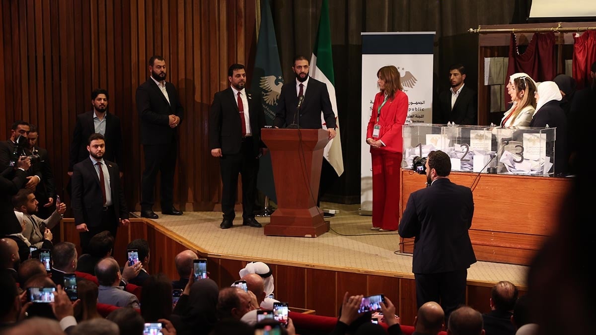 Seçim günü Ulusal Kütüphane’de yetkililerle bir araya gelen Geçici yönetim Cumhurbaşkanı HTŞ lideri Ahmed Şara, Suriye’nin hassas sürecine dikkat çekerek, savaş ve kaos ortamından kısa sürede seçim sürecine geçmenin önemini vurguladı.