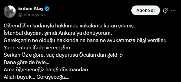 Gazeteci Erdem Atay, sosyal medya hesabından yaptığı açıklama ile hakkında yakalama kararı çıkarıldığını açıkladı.