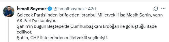 19 Temmuz 2025 tarihinde Gelecek Partisi’nden ayrılan İstanbul Milletvekili İsa Mesih Şahin, uzun bir süredir sessizliğini koruyordu. Ancak gazeteci İsmail Saymaz’ın haberine göre, Şahin, Cumhurbaşkanı Recep Tayyip Erdoğan’la Cumhurbaşkanlığı Külliyesi’nde bir araya geldi ve AK Parti’ye geçiş süreci netlik kazandı.