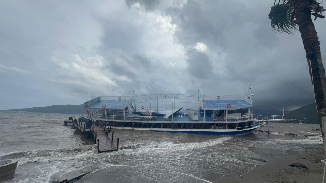 Muğla’nın Marmaris ilçesinde dün gece başlayan sağanak yağış ve fırtına sabah saatlerinden itibaren etkisini artırırken, denizde de etkisini gösteren fırtına sebebiyle bazı tekneler de sürüklendi.