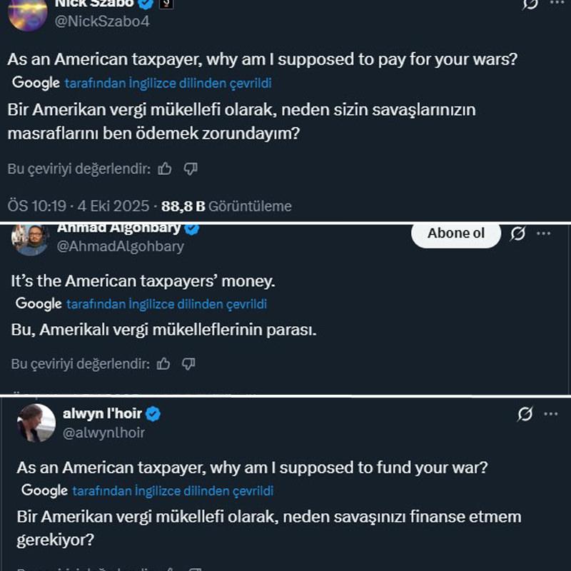 ABD’li kullanıcılar, “Neden sizin eğitim ve sağlık giderlerinizi, askeri operasyonlarınızı finanse ediyorum?” şeklinde sorular yöneltti.