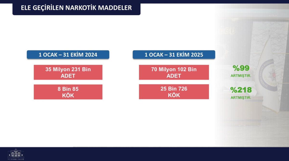Ele geçirilen uyuşturucu hap miktarı geçen yılın aynı dönemine göre iki katına çıktı, kenevir miktarı ise üç katını aştı. Yine çocuklarımızı bu tehlikeden uzak tutmak ve güvenliklerini sağlamak için okullarımızın etrafındaki kafe, park ve bahçelerdeki denetimlerimizi aralıksız sürdürüyoruz.