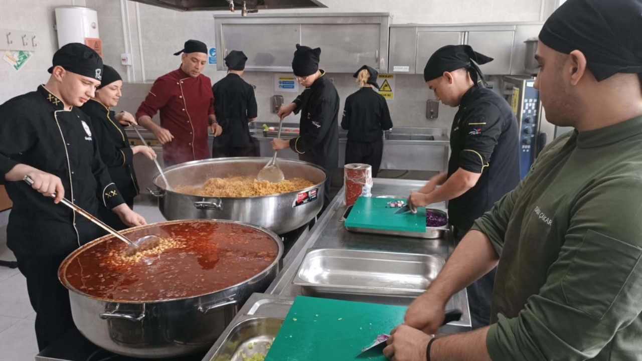 Cumhurbaşkanlığı Mesleki Eğitim Politika Belgesi’yle uyumlu olarak hazırlanan çalışmada; öğretmenler, öğrenciler ve kaymakamlık destek personeli tarafından hazırlanan yemekler, ilçe genelindeki 7 okulda bini aşkın öğrenciye ücretsiz ulaştırılıyor. Mesleki ve Teknik Eğitim Genel Müdürlüğü tarafından bütçelendirilen lisenin Yiyecek İçecek Hizmetleri alanında hazırlanan yemeklerde kazanlar, her gün öğrenciler için kaynıyor.