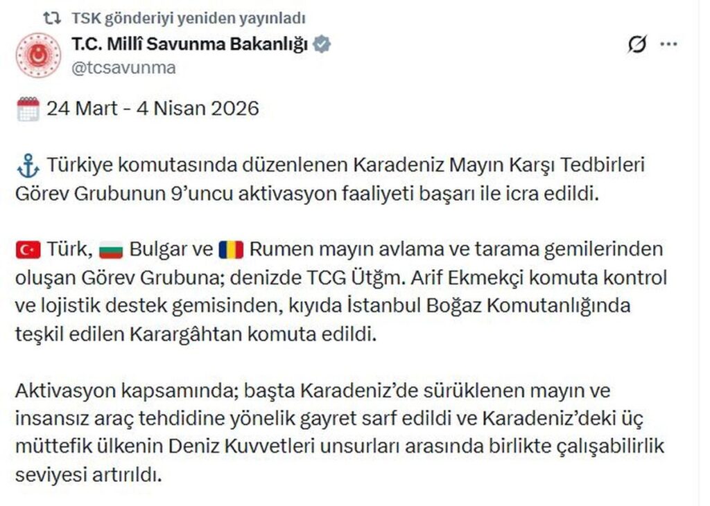 Eğitim Karadeniz’de Mayın Karşı Tedbirleri Başarıyla Gerçekleşti MSB, Türkiye komutasıyla düzenlenen 9. Mayın Karşı Tedbirleri faaliyeti başarıyla icra edildi. Hakan Kaplan 7 Nisan 2026 MİLLİ Savunma Bakanlığı (MSB), Türkiye komutasında düzenlenen Karadeniz Mayın Karşı Tedbirleri Görev Grubu’nun 9’uncu aktivasyon faaliyetinin başarı ile gerçekleştirildiğini açıkladı. Bakanlığın sanal medya hesabından yapılan açıklamada, “Türkiye komutasında düzenlenen Karadeniz Mayın Karşı Tedbirleri Görev Grubu’nun 9’uncu aktivasyon faaliyeti başarı ile icra edildi. Türk, Bulgar ve Rumen mayın avlama ve tarama gemilerinden oluşan Görev Grubuna; denizde TCG Üsteğmen Arif Ekmekçi komuta kontrol ve lojistik destek gemisinden, kıyıda İstanbul Boğaz Komutanlığında teşkil edilen karargahtan komuta edildi. Aktivasyon kapsamında; başta Karadeniz’de sürüklenen mayın ve insansız araç tehdidine yönelik gayret sarf edildi ve Karadeniz’deki üç müttefik ülkenin Deniz Kuvvetleri unsurları arasında birlikte çalışabilirlik seviyesi artırıldı” ifadelerine yer verildi. Tags: Komuta Related Stories Timetürk yazarı Gülçin Ertunç Mimar Sinan’ın eseri Kurşunlu Han’ı yazdı Eğitim Timetürk yazarı Gülçin Ertunç Mimar Sinan’ın eseri Kurşunlu Han’ı yazdı 7 Nisan 2026 Son açıklaması gündeme getirdi: Donald Trump’ın İran’a yaptığı tüm uyarılar Eğitim Son açıklaması gündeme getirdi: Donald Trump’ın İran’a yaptığı tüm uyarılar 7 Nisan 2026 Trump’ın yardımcısı Vance’dan kritik İran açıklaması Eğitim Trump’ın yardımcısı Vance’dan kritik İran açıklaması 7 Nisan 2026