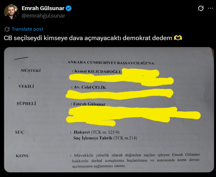 Emrah Gülsunar, Kılıçdaroğlu’nun açtığı davayı sosyal medya platformu X hesabından paylaştı. Kılıçdaroğlu’nun avukatı Celal Çelik tarafından yapılan başvuruya yanıt veren Gülsunar, paylaşımında, Kılıçdaroğlu’nun cumhurbaşkanı adaylığı döneminde “kimseye dava açmayacağım” vaadine göndermede bulundu.