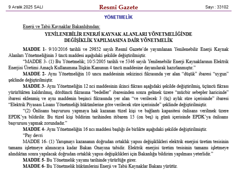 Düzenleme, yenilenebilir enerji yatırımlarının süreçlerini sadeleştiren ve uygulamada karşılaşılan bazı belirsizlikleri ortadan kaldıran önemli hükümler içeriyor.