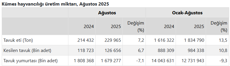 Ağustos ayında bir önceki yılın aynı ayına göre, tavuk yumurtası üretimi yüzde 7,1 azaldı, kesilen tavuk sayısı yüzde 6,7 arttı, tavuk eti üretimi yüzde 7,2 arttı. Ocak-Ağustos döneminde bir önceki yılın aynı dönemine göre, tavuk yumurtası üretimi yüzde 9,3 azaldı, kesilen tavuk sayısı yüzde 10,8 arttı, tavuk eti üretimi yüzde 13,5 arttı.